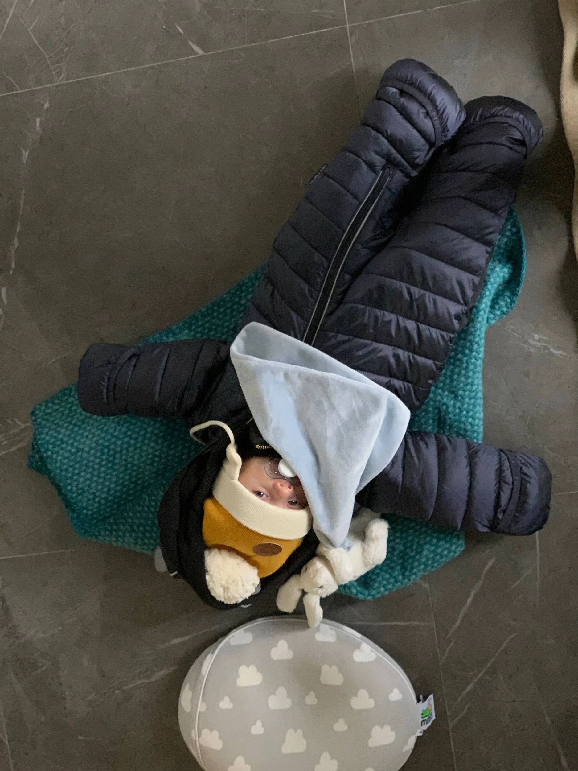Åt frukost samtidigt som jag ammade Harry, proppade i honom lite extra ersättning och satte sedan på honom en ulljumpsuit, sen en i fleece och till sist en i dun. En halskrage och dubbla ullsockor (finns även i barnsize) och en mössa mini fått ärva av Emil. Sen ner i vagnen där vi har en fårfäll i botten och hans kudde och sen en filt över. Eller ja, först får han mellanlanda på hallgolvet medan jag klär mig och plockar ihop en akutväska (torrt ombyte, napp, blöja & lite extra ersättning). Sen lägger jag ned honom i vagnen och rullar ut.