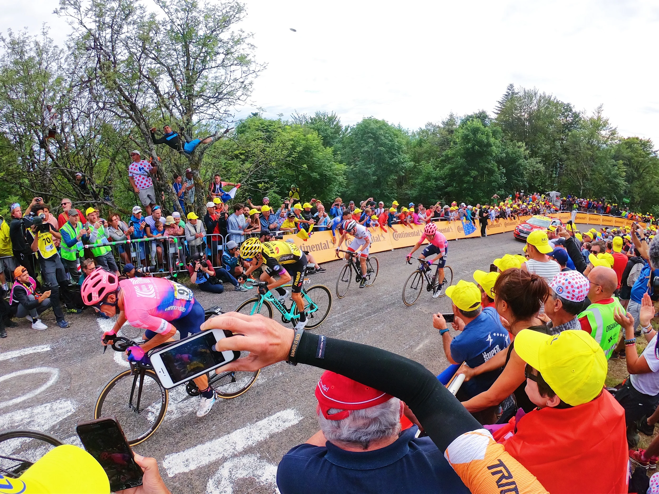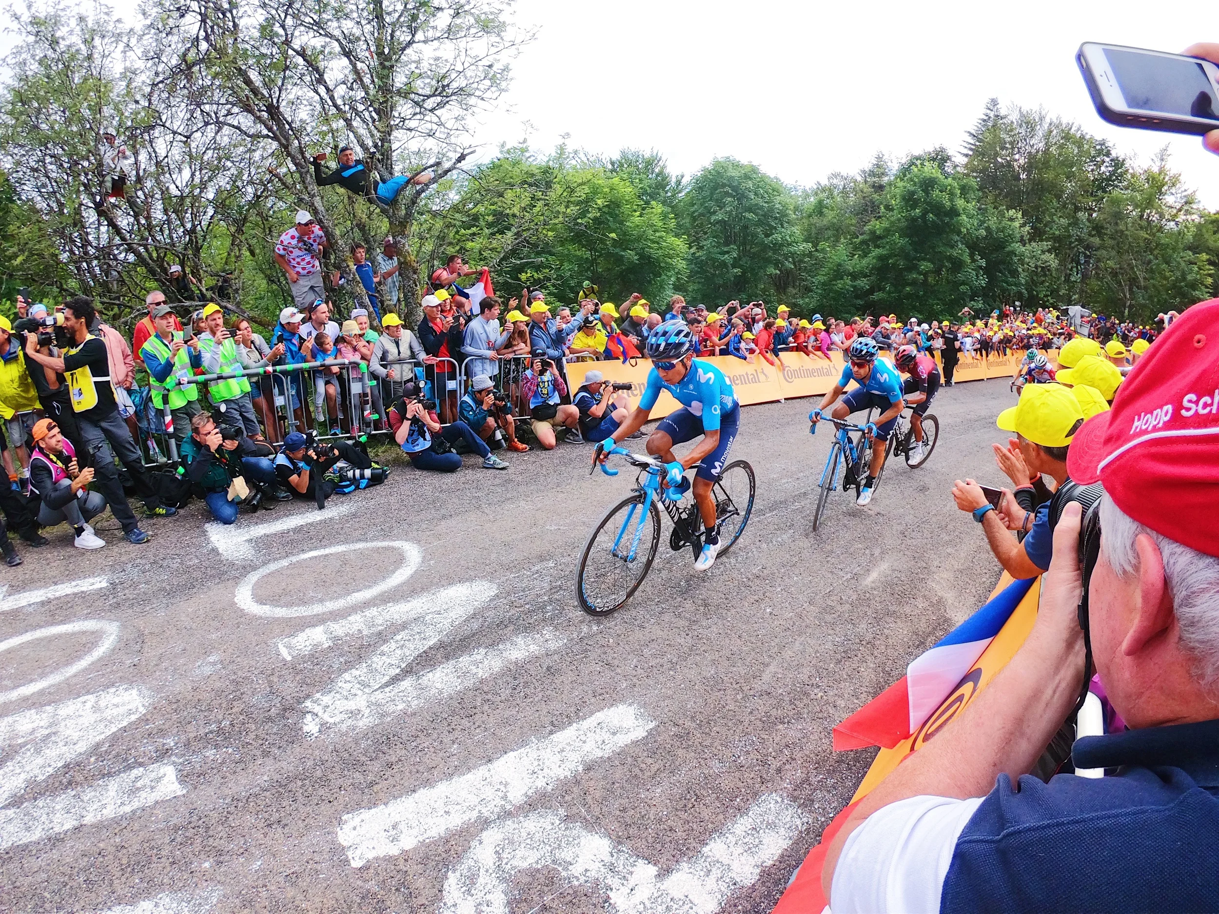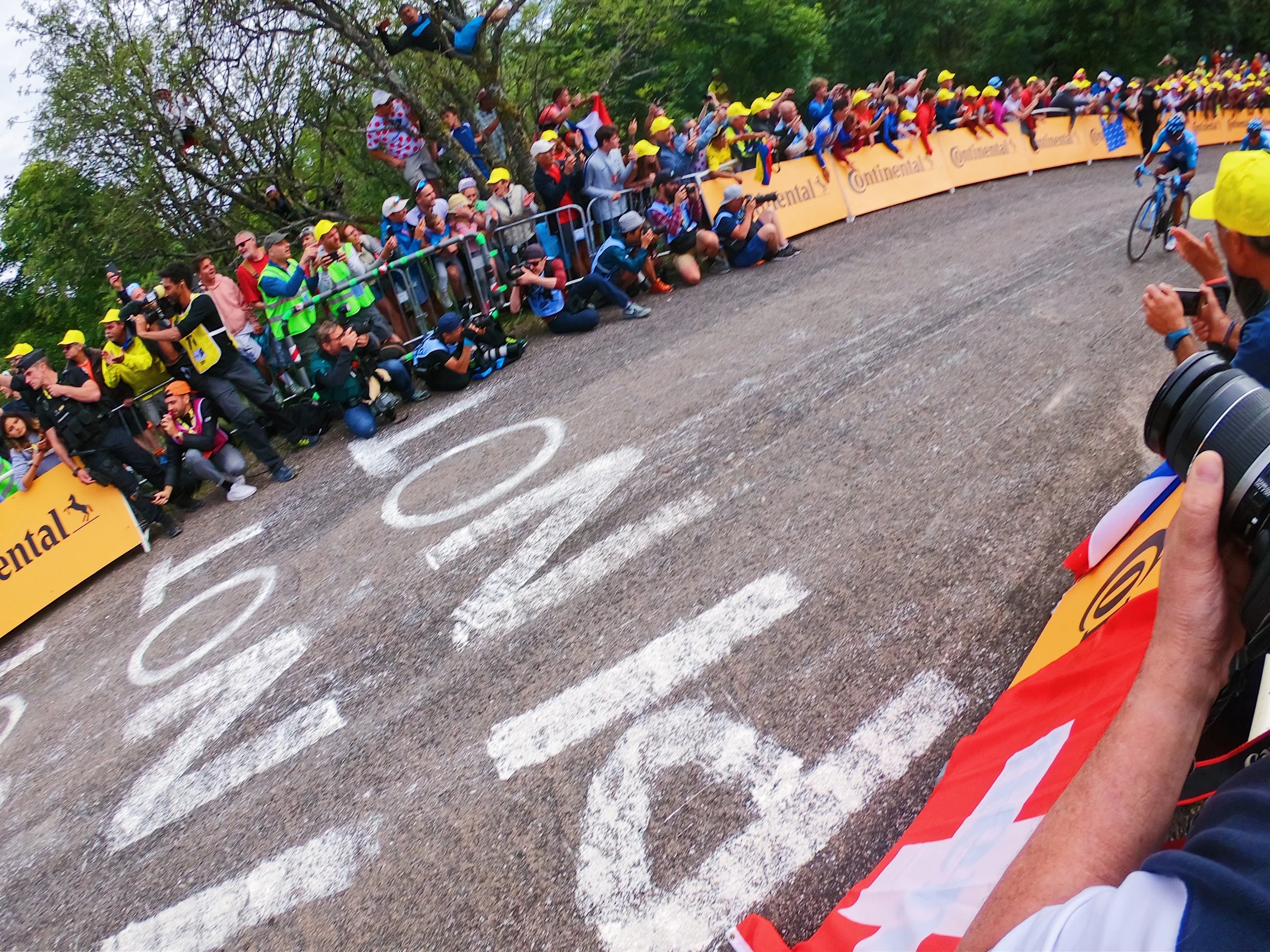 Men när väl målgången närmade sig kunde man nästan ta på stämningen. Folk började ställa sig och den tidigare typiskt slöa franska attityden blev plötsligt något helt annat. Jubel och spontana sånger. Trumpeter och megafoner. Trummande på skyltar. Och varje gång någon passerade oss där vi stod, hundra meter till mål, fullkomligt exploderade publiken. Tänkte för mig själv att de skulle trötta ut sig tills det verkligen gällde.