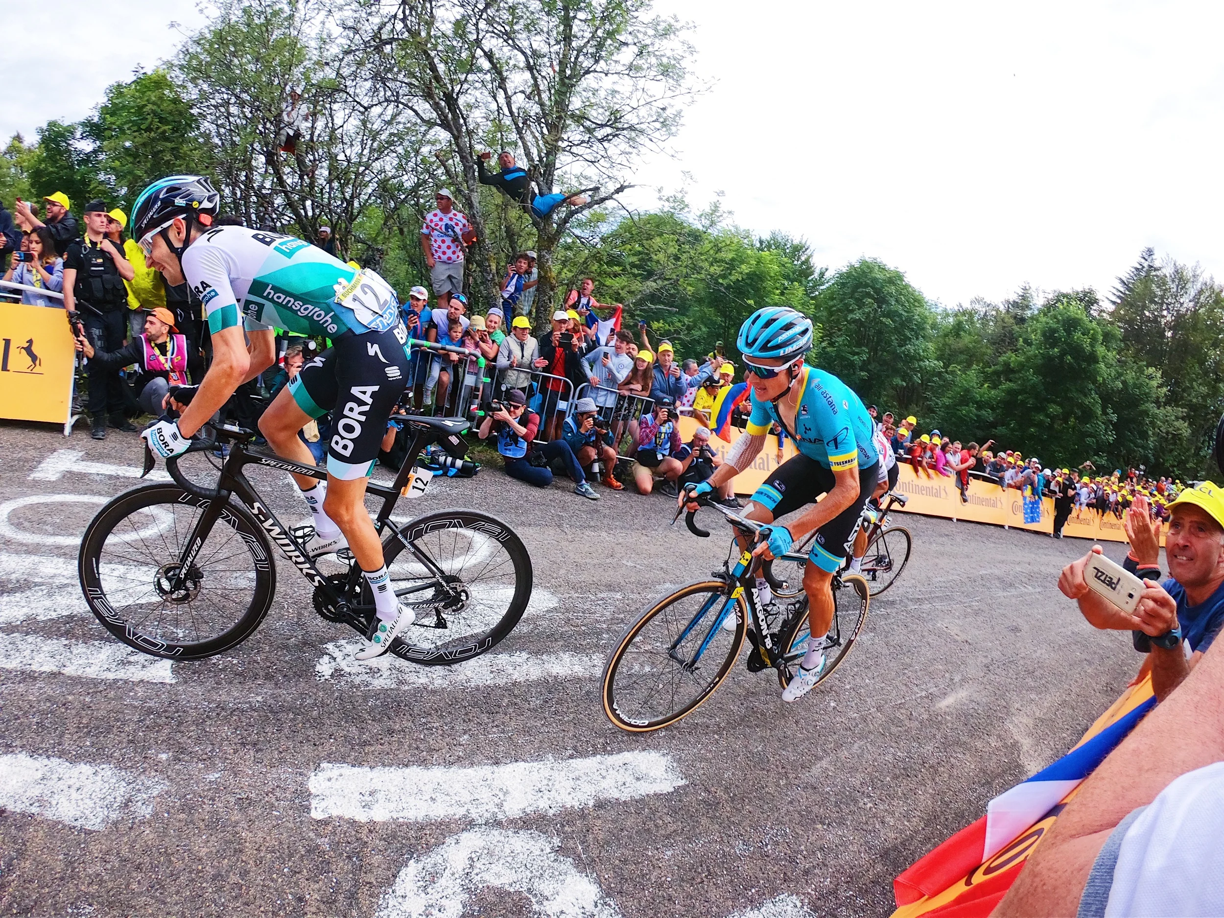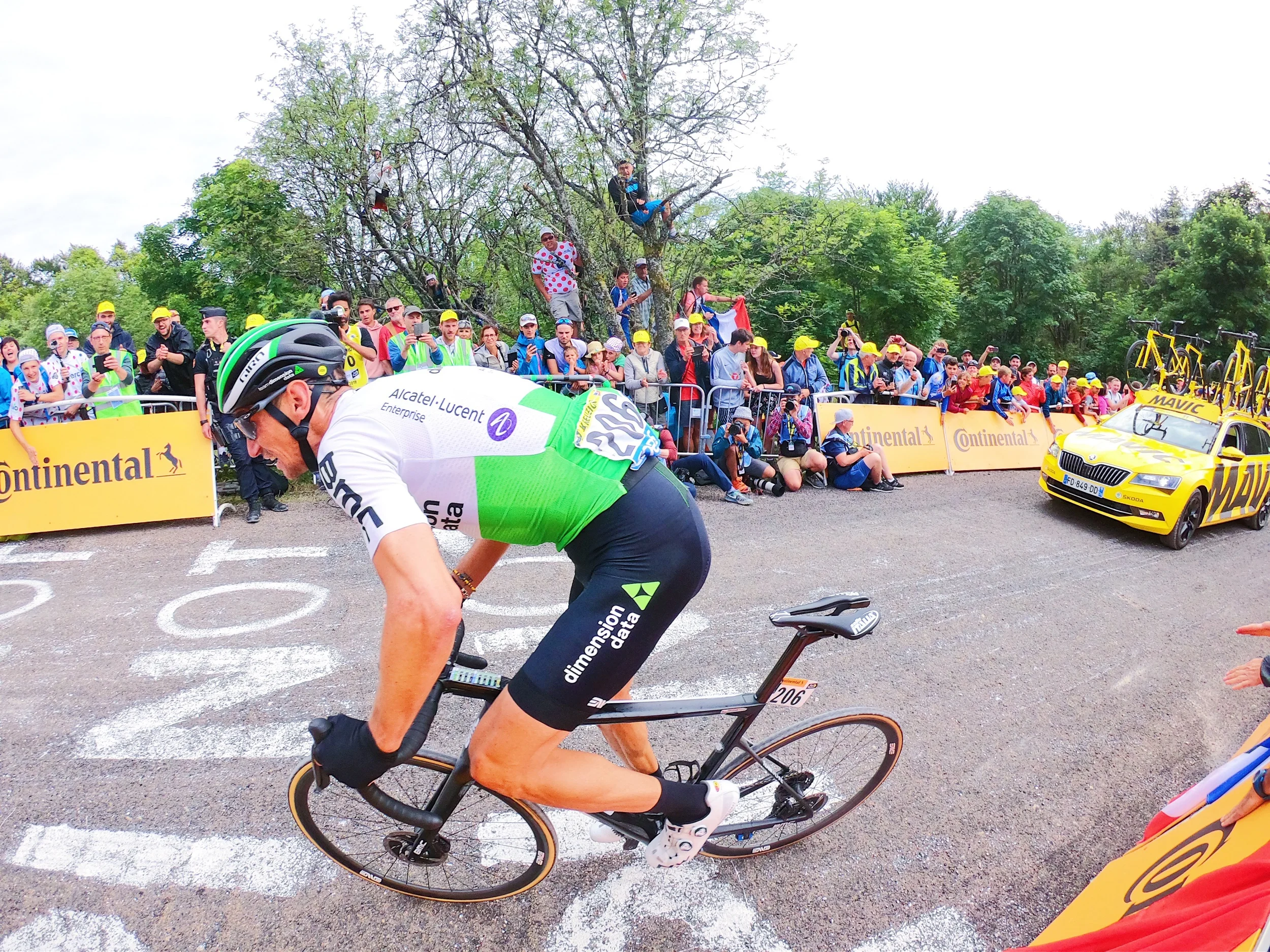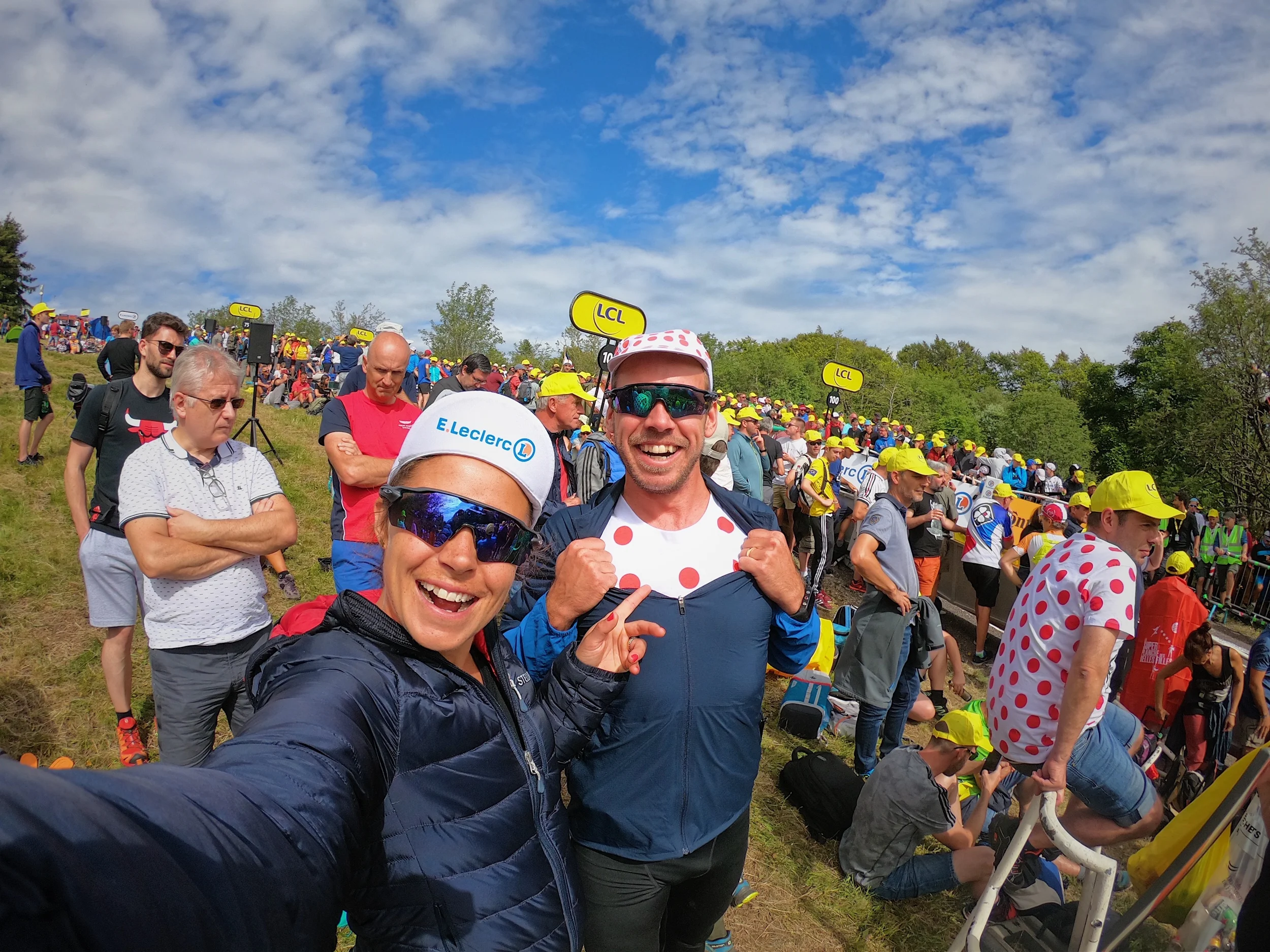 Men när väl målgången närmade sig kunde man nästan ta på stämningen. Folk började ställa sig och den tidigare typiskt slöa franska attityden blev plötsligt något helt annat. Jubel och spontana sånger. Trumpeter och megafoner. Trummande på skyltar. Och varje gång någon passerade oss där vi stod, hundra meter till mål, fullkomligt exploderade publiken. Tänkte för mig själv att de skulle trötta ut sig tills det verkligen gällde.