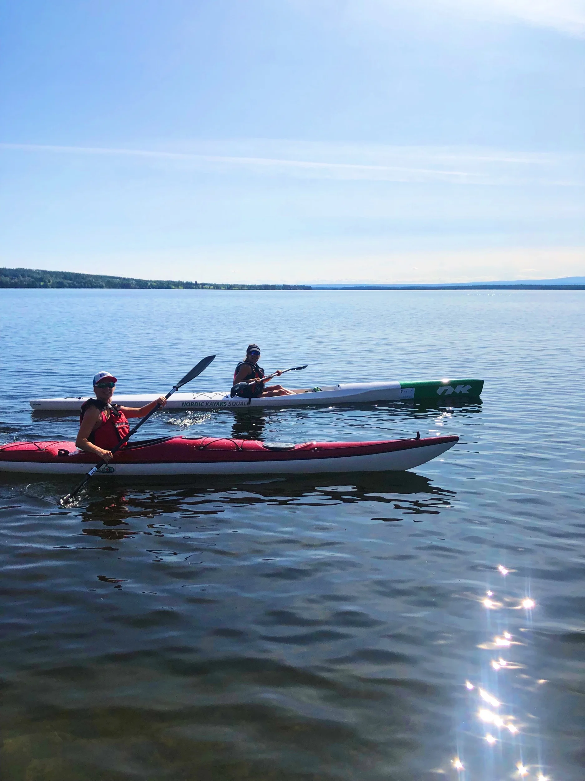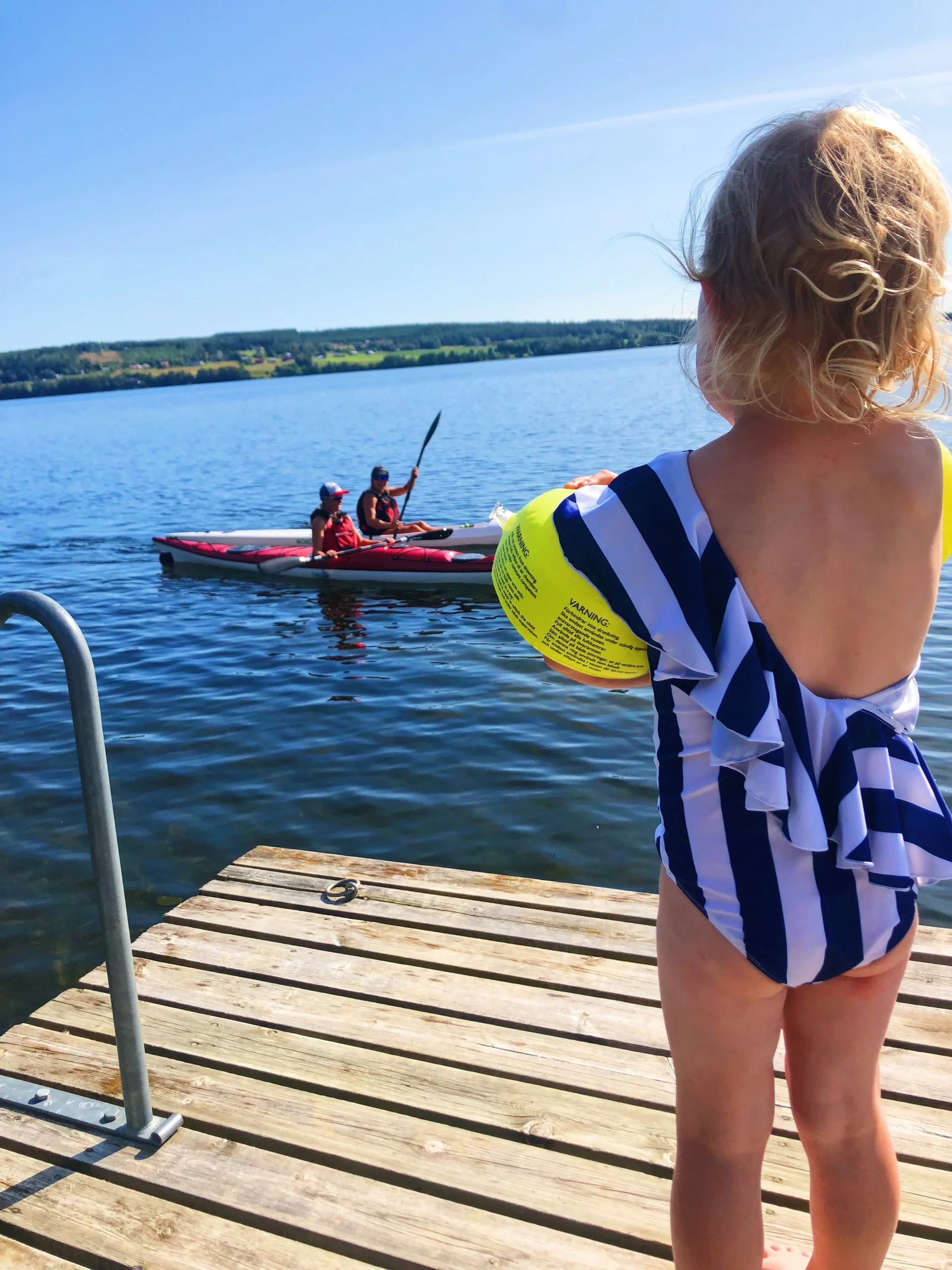 Efter att ha svettats som ena tokar i solen på lunchen bestämde vi oss för att ta årets första (och förhoppningsvis inte sista) kajaktur på sjön. Åkte hem, bytte om och rullade ned till Teos föräldrar som bor vid vattnet rakt nedanför oss. Där var kidsen och lekte, så medan jag och Sanna paddlade, åkte Teo båt med kidsen och Emil simmade. Helt drömskt! Jag och Sanna pratade om just det - hur fantastiskt Östersund är på de fina dagarna, oavsett årstid. Livskvalitén finns verkligen här. Det gäller bara att använda sig av allt som naturen och miljön erbjuder här. Det ska bli höstens mission - utnyttja Jämtland till fullo!