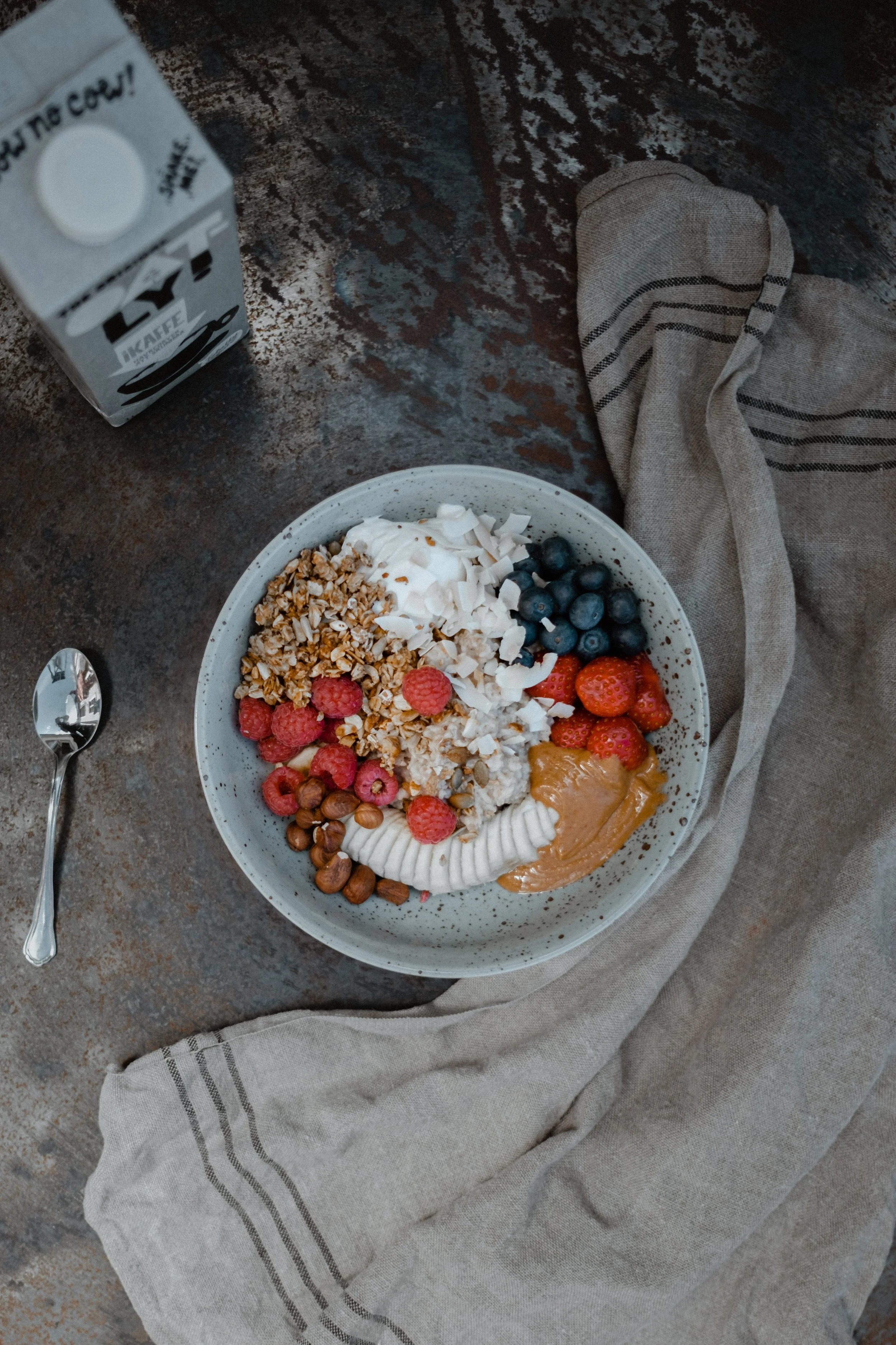 Jag äter frukost kring halv åtta, oftast havregrynsgröt som jag ”kryddar” med kanske ett knäckt ägg i själva gröten, frukt, bär och soygurt till. Jordnötssmör och granola. Och tränar jag före frukost tar jag ett extra mellanmål före träningen bestående av typ en banan och ett glas juice. Och kör jag hårt har jag sportdryck och eventuellt även torkad frukt på själva passet.
