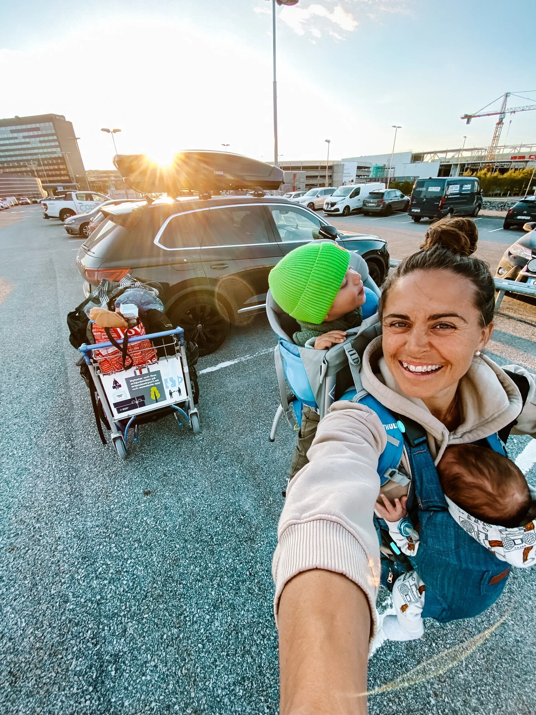Väl i Zurich blev det lite mer stök och bök. Jag hade enormt med bagage, kunde inte sätta storebror på vagnen, utan fick bära honom på axlarna, ha lillebror på magen och sen försöka styra en ÖVERFULL bagagevagn. Och när jag skulle hämta ut hyrbilen brakade lite av helvetet lös med en över trettio minuter lång väntan på att få nyckel till bil, skrikande bebis (fick amma i kön), trött storebror som dessutom bajsade mitt i allt och en hungrig mamma… Tillslut fick vi hyrbilen, bytte blöja på båda kidsen, satte i bilstolarna (som jag hyrde på plats), packade i bagaget i bilen, ställde in gpsen på Livigno och rullade ut. Och insåg ”jag hade glömt att äta lunch…”. Det trodde jag ALDRIG skulle ske! Haha! Som tur var hade jag energibars och torkad frukt med så det gick egentligen ingen nöd på mig.