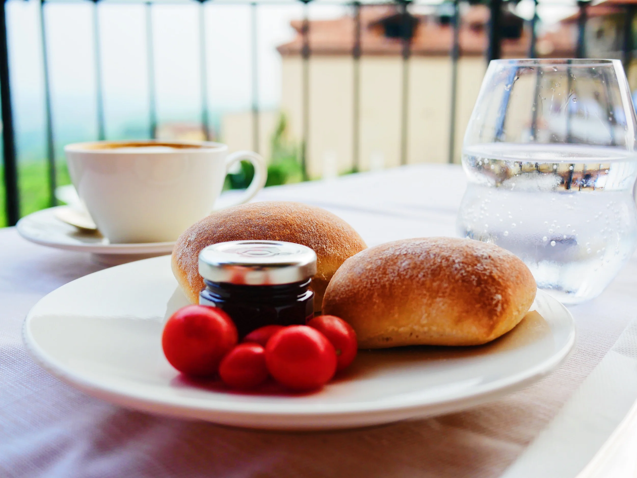 En sista frukost på terrassen med utsikt över dalgången och bergen. Med en riktigt bra cappuccino, italienskt surdegsbröd, marmelad och äggröra.